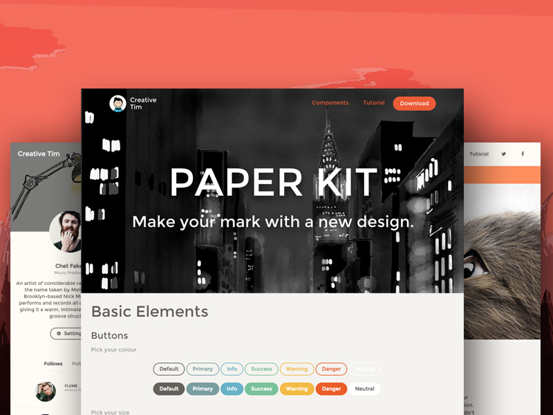 Paper Kit is a free Bootstrap UI kit that can get you going in a new creative direction! To say the least, it's different since it's not material, flat or iOS inspired.